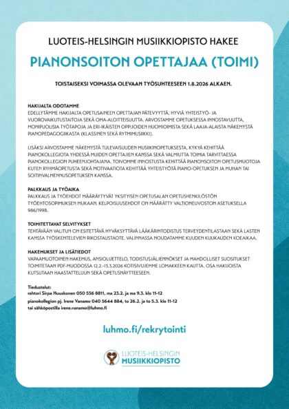 Pianonsoiton päätoiminen tuntiopettaja Raahen musiikkiopisto hakee opettajajoukkoonsa määräaikaiseen tehtävään ajalle 1.8.2026-31.7.2027 pianonsoitonopettajaa, joka omalla työpanoksellaan haluaa osallistua aktiivisesti ja innolla vireän oppilaitoksen toimintaan. Tehtävään kuuluu pianonsoitonopetus eri tasoilla, ja tuntimäärään sisältyy myös jonkin verran säestystä. …