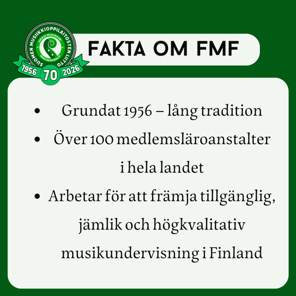 FMF är stolt över att representera detta nätverk av läroanstalter som utför ett kompromisslöst och högklassigt arbete i hela Finland. Musiken tillhör alla – och förbundet arbetar varje dag för att förverkliga denna övertygelse i praktiken.