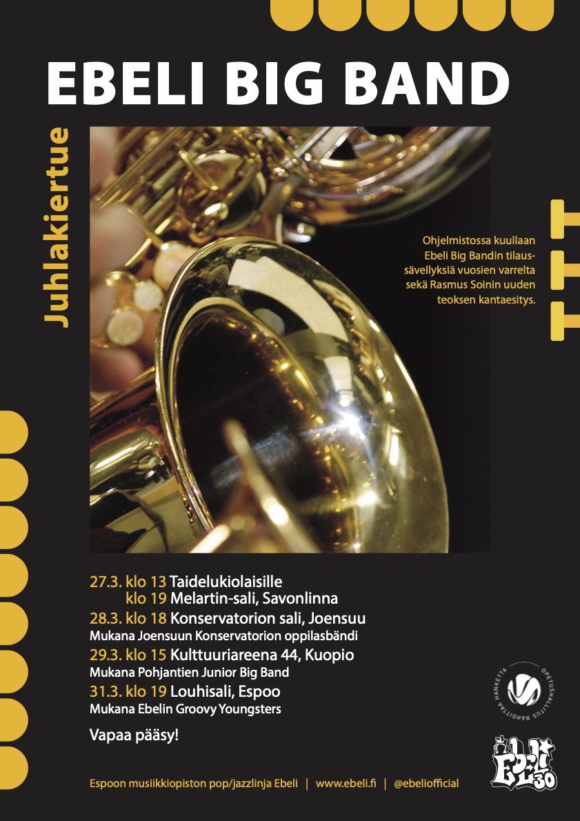 Ebeli Big Band kapellimestarinaan Rasmus Soini konsertoi Savonlinnassa 27.3., Joensuussa 28.3. ja Kuopiossa 29.3. Kiertue päättyy Espoon kulttuurikeskuksen Louhisaliin tiistaina 31.3. klo 19! Juhlaohjelmistossa kuullaan orkesterin tilausteoksia vuosien varrelta, eli kotimaisten jazzsäveltäjien tuotantoa erityisesti nuoriso-big bandille sävellettynä. Konsertteihin on vapaa pääsy, tervetuloa!