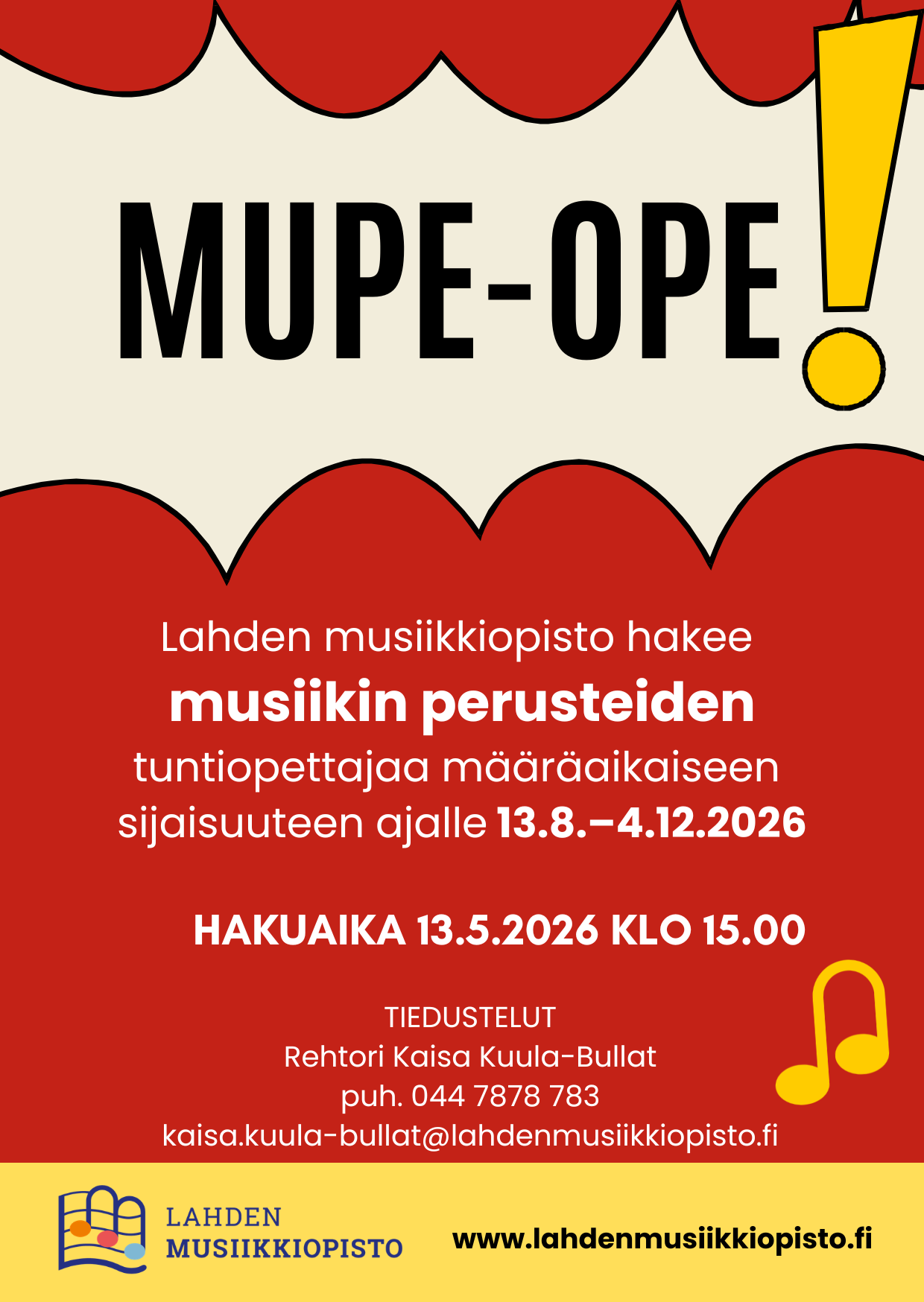 Lahden musiikkiopisto hakee musiikin perusteiden tuntiopettajaa määräaikaiseen sijaisuuteen ajalle 13.8.–4.12.2026.