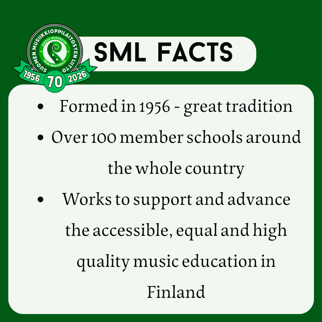 The Finnish Association of Music Schools (SML) is the national umbrella organisation for Finland’s music schools. With 100 member institutions across the country, SML represents both music schools and conservatories — 89 music institutes and 11 conservatories – stretching from our southernmost city far into the arctic Lapland and from the eastern frontier to the west coast of the country. Our members are maintained by 55 municipalities or joint municipal authorities and 45 private associations, reflecting the diversity and inclusiveness of the Finnish music education landscape.